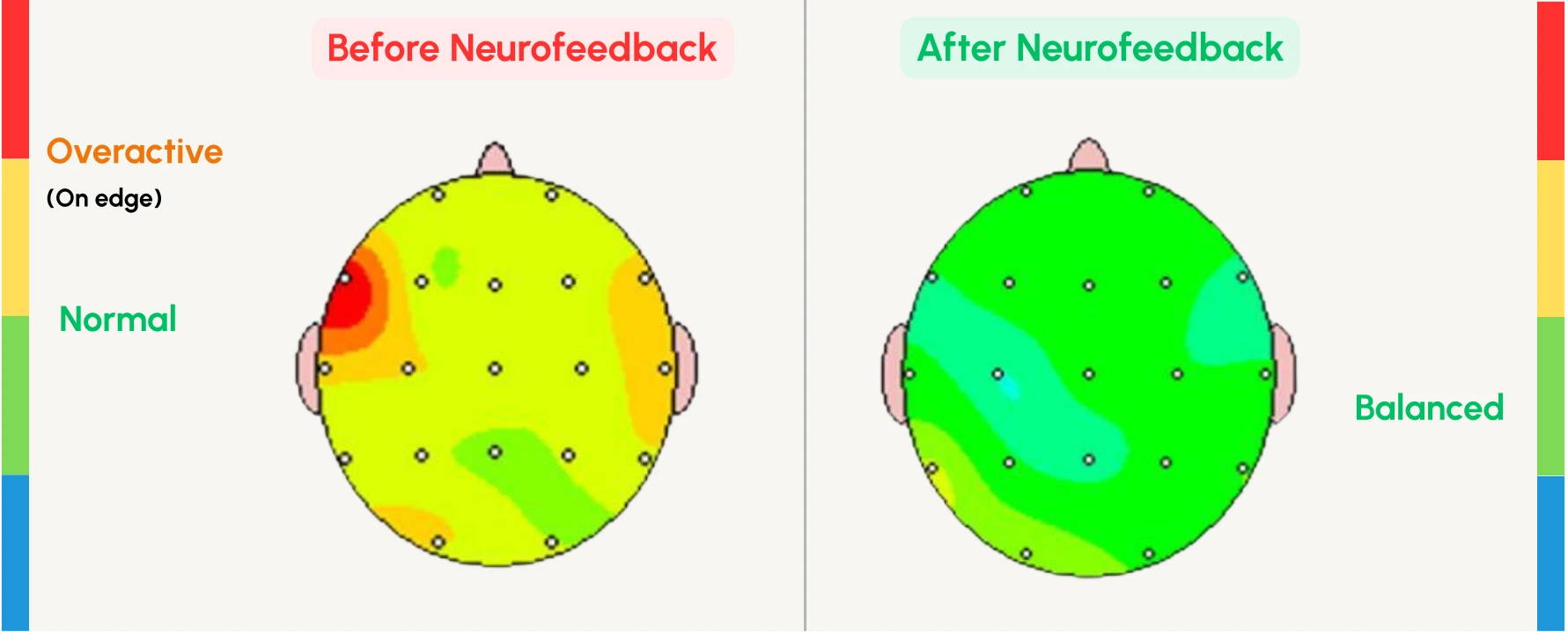 Most clients feel an instant ‘aha’ moment when they see how their brain is overactive in certain areas leading to symptoms like anxiety. With Neurofeedback we train your brain from being overactive to calm and balanced with non-invasive approach.